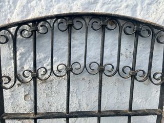 Reja de ventana antigua de hierro forjado con un diseño ornamental. - Estructura de barras verticales y horizontales. - Adornos en espiral en la parte superior. - Soportes laterales para fijación.