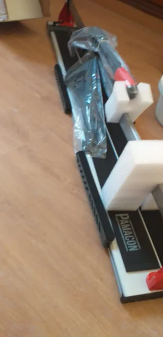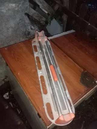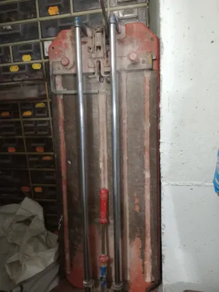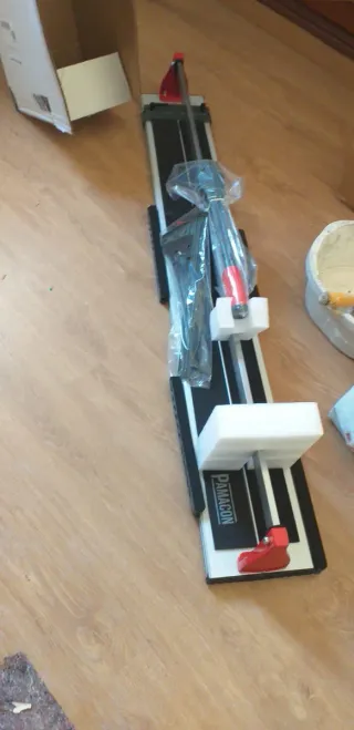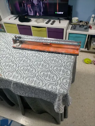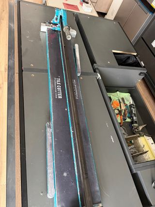 Corta azulejos de la marca VEVOR, diseñado para cortes precisos. - Base negra con guías de corte. - Brazo de corte azul. - Soporte lateral ajustables -usada solamente para poner suelo de mi casa, para azulejos de 120 cm o menos -maquinarias de buen tamaño ideal para albañiles ,o manitad