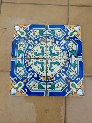 Par de azulejos antiguos con un diseño floral característico de Sevilla. Estos azulejos presentan un patrón intrincado con colores vibrantes. - Diseño floral. - Colores: azul, verde, blanco y marrón.