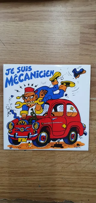 Azulejo decorativo con la ilustración Soy Bombero. - Diseño de bombero en un coche de época. - Colores vivos y estilo de cómic. - Ideal para coleccionistas o amantes de lo retro.