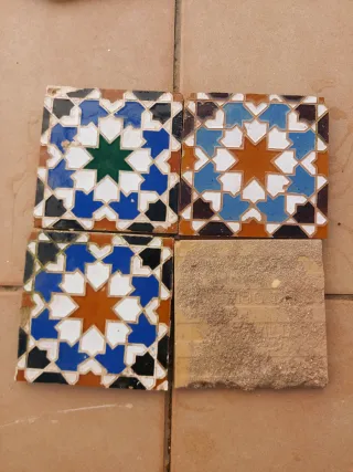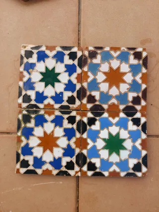 Conjunto de dos azulejos antiguos con diseño inspirado en Sevilla. Cada azulejo presenta un patrón decorativo con colores vivos. - Diseño geométrico. - Tonos verdes, azules y ocres.