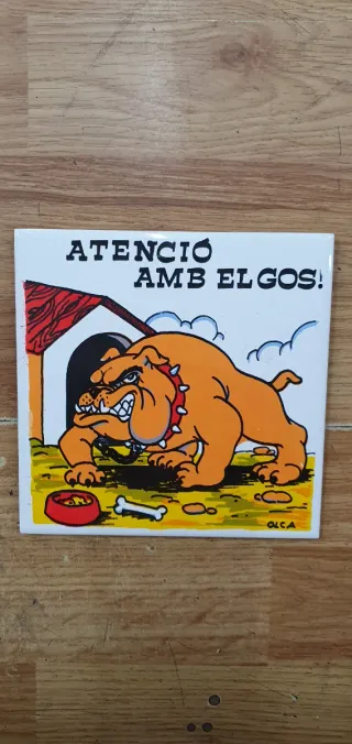 Azulejo decorativo con la imagen de un Fox Terrier. - Diseño de Fox Terrier. - Texto Cuidado con el Perro.