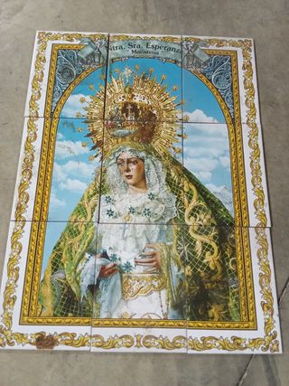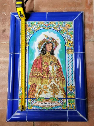 Cerámica decorativa de la Virgen del Rocío. - Representación de la Virgen del Rocío (Pastora). - Marco de azulejos azules. - Diseño detallado Estaba puesto en la pared y se ha quitado cuidadosamente, sin desperfectos, tal y como se ve en las fotos. Ver medidas en las fotos.