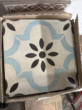 Azulejo con un diseño geométrico y floral en tonos beige, terracota y azul. Su medida es 32,5×32,5 cm. Son 12 piezas por caja. 70 euros las 4 cajas. - Diseño inspirado en azulejos hidráulicos. - Acabado mate. - Ideal para paredes y suelos.