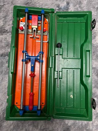 Cortadora de azulejos profesional Rubi en su maletín. - Maletín de transporte verde. - Base naranja. - Guías metálicas.