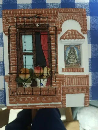 Bonito azulejo decorativo con diseño de fachada. - Representa una ventana con reja y flores. - Incluye un pequeño nicho con una imagen religiosa. - Marco de ladrillo visto y detalles en blanco.