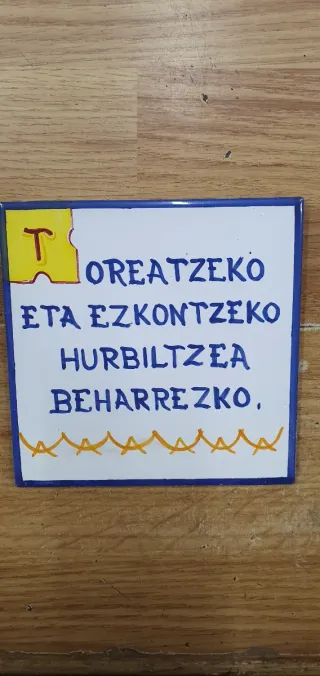 Azulejo decorativo con diseño original. - Texto en euskera. - Bordes azules. - Dibujo decorativo en la parte inferior.