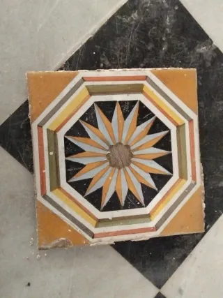Conjunto de azulejos antiguos con un diseño octogonal central.. Medidas 20cm x 20cm de principios siglo XX - Diseño con estrella central. - Bordes decorados con múltiples colores. - Tonos ocres y blancos predominantes.