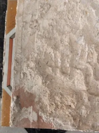 Pieza de azulejo con diseño antiguo y textura rústica. - Material: Cerámica o similar. - Acabado: Texturizado y con relieve. - Color: Tonalidades tierra y beige.