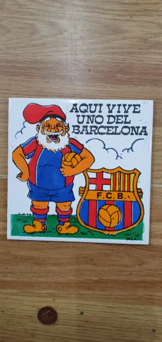 Azulejo decorativo del FC Barcelona con un dibujo de un personaje y el escudo. - Diseño con el escudo del FC Barcelona. - Ilustración de un personaje con gorro y barba. - Texto AQUI VIVE UNO DEL BARCELONA.