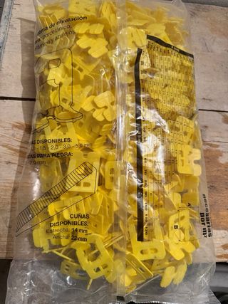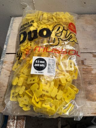 Pack de 300 niveladores de azulejos Duo-Fix. Dispongo de varias bolsas, el precio es 20€ por bolsa. - Grosor de 0,5 mm. - Color amarillo. - Sistema de nivelación patentado.