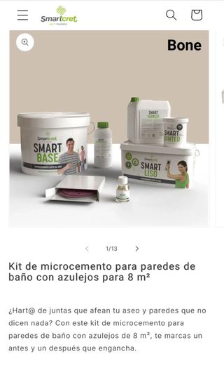 Kit de microcemento para paredes de baño con azulejos. SIN ABRIR Es lo que me sobró de la reforma que hice en casa. - Incluye Smart Base. - Incluye Smart Varnish + Smart Booster. - Incluye Smart Jointer. - Incluye lijas de 3 gramajes (P220, P40, P220) y la llana de poliuretano para aplicarlo. FALTA Smart Liso que se me acabó, se puede comprar suelto en la página web. El pack sin la llana ya vale 385,76€ en la página web de SmartCret. - Color: Bone. (Adjunto foto de como quedó mi baño).