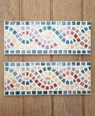 Lote de 90 unidades de preciosa cenefa decorativa de cerámica de la marca Porcelanosa con diseño de mosaico. Se podria usar como azulejo. - Motivo de espiral entrelazada. - Combinación de teselas en tonos tierra, verde y crema. - Borde exterior con teselas cuadradas verdes y crema. Lote entero 80 euros, medidas aprox 11 cm x 28 cm. 2.70 m2 aprox