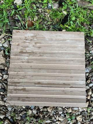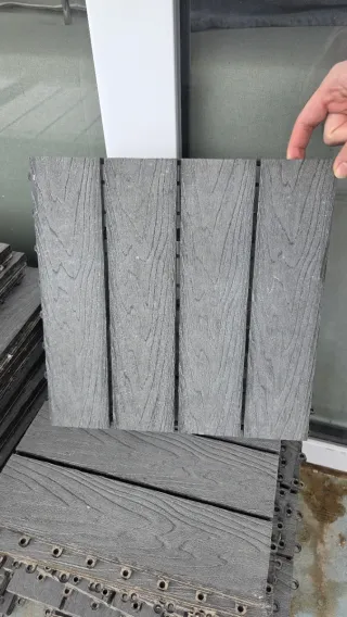 Baldosas de exterior de Leroy Merlin en color gris y tamaño 50x50 cm. - Diseño imitación madera. - Aptas para terrazas y jardines. Lote 45 baldosas precio original: 675€ Precio venta baldosa ud 11€ Precio lote baldosas completo 450€