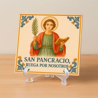 Azulejo decorativo con ilustración tradicional de San Pancracio, ideal para regalar o para colocar en casa o negocio como símbolo de protección y buenos deseos. Es un azulejo cerámico apto para interior y exterior, resistente y duradero. Disponible en dos medidas: 15x15 cm y 20x20 cm. 🔸 Se puede personalizar a gusto (texto, detalles o adaptaciones). 🔸 Perfecto para entradas, cocinas, despachos o comercios. Disponible en 👉 tuazulejo.es