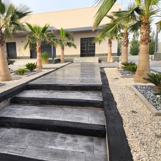 Superficie de hormigón impreso con acabado de piedra natural. Ideal para patios, terrazas y caminos. - Diseño imitación piedra. - Color arena. - Resistente a la intemperie.