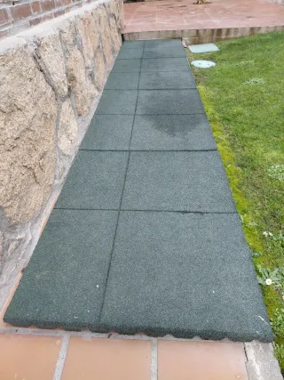 Conjunto de losetas de suelo diseñadas para uso en exteriores. Presentan un patrón de líneas horizontales y una textura granulada. - Material resistente para exteriores. - Diseño con líneas. - Textura granulada. - Por cambio de suelo del jardín vendo las baldosas,se unen fácilmente unas con otras,dispongo de 72 baldosas. - Algunas tienen signos de desgaste como es lógico debido a su uso,lo dejo claro,cada baldosa mide 31 * 31 centímetros Precio por baldosa individual 0'75 euros,haría descuento por todo el lote.