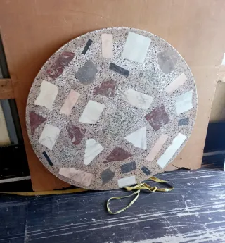 MESA DE TERRAZO SIN PIE. ESTA HECHO DE PIEDRA CON INCRUSTACIONES DE MÁRMOL. MEDIDAS: DIÁMETRO: 100 CM ( 1 METRO ) GROSOR : 3 CM PERFECTO PARA USAR EN EXTERIOR IDEAL PARA DARLE UN TOQUE RÚSTICO Y ELEGANTE A TU HOGAR