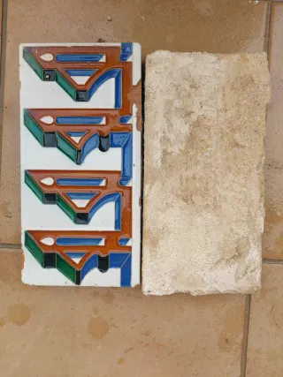 Se vende resto de Azulejo Sevillano. Es como un plinto para terminación de pared. De este modelo me quedan únicamente 14 unidades. 20 cm x 5 cm y 0,5 cm de grosor. Se regala un azulejo azul entero ( última foto ). Este último azulejos mide 20 cm x 15 cm y 0,5 cm de grosor