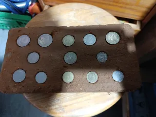 Ladrillo antiguo con monedas incrustadas