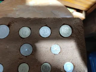 Pieza decorativa de ladrillo de barro antiguo con varias monedas incrustadas. - Ladrillo de barro de color terracota. - Monedas de diferentes tamaños y diseños. - Ideal para coleccionistas o decoración rústica.