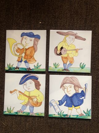 Conjunto de cuatro azulejos decorativos con motivos de músicos. Son reproducciones de originales medievales y barrocos Azulejos diseñados y pintados a mano en la década 1990. Cada unidad 15€. Los 4 por 50€ - Diseño de estilo vintage. - Cada azulejo representa a un músico con un instrumento. - Ideal para coleccionistas o decoración temática.