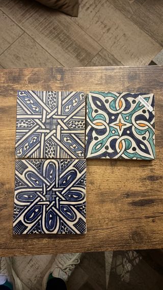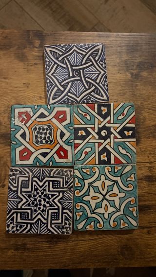 Conjunto de 10 baldosas decorativas de estilo artesanal de marruecos (Hay algunos que estoy usando) Talla : 10/10 y 15/15 cm - Diseño geométrico y floral. - Colores azul, blanco, verde y naranja. - Acabado brillante. El precio por unidad es 5€ Lote 40€ Tamano 10/10 cm A retirar en mi tienda del barrio gotico