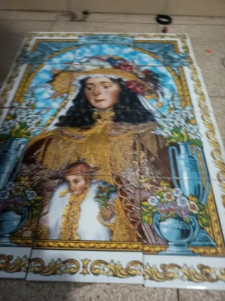 Conjunto de azulejos decorativos con la imagen de la Virgen del Rocío Pastora. -Nunca se ha colocado. - Diseño detallado con motivos florales y jarrones. - Marco ornamental dorado y azul. -12 Azulejos de 15 x 15