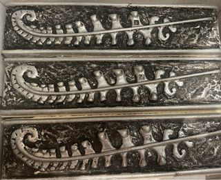 Conjunto de 12 cenefas decorativas para baño con diseño inspirado en barcos vikingos. - Diseño detallado en relieve. - Acabado plateado y negro. Cada cenefa mide 24,5 cm. No llega a 16€ la cenefa.