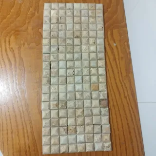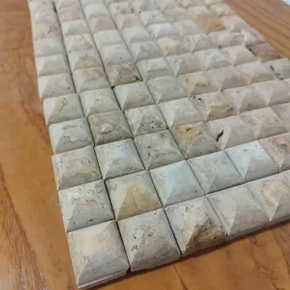 Conjunto de azulejos de piedra natural con un diseño piramidal. - Material: Piedra natural. - Acabado: Texturizado y con variaciones de color. - Diseño: Mosaico con piezas en relieve. -150 piezas 3x3x2 cm