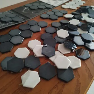 Lote de azulejos hexagonales en tonos negros y blancos. Ideales para proyectos de decoración. - Diseño moderno hexagonal. - Combinación de colores versátil. Mas de 100 piezas, 4x5 cm
