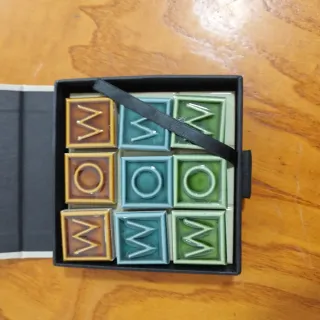 Conjunto de nueve azulejos decorativos con la palabra WOW grabada. Cada azulejo tiene un diseño y color diferente, creando un efecto visual atractivo. - Nueve azulejos individuales. - Diseño con la palabra WOW. - Colores variados: marrón, azul verdoso y verde. - Acabado brillante.