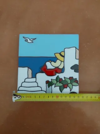 Precioso azulejo decorativo esmaltado con un diseño mediterráneo. - Representa una escena costera con una persona sentada y un ave volando. - Colores vivos y acabado brillante. - Ideal para añadir un toque de encanto a cualquier espacio.