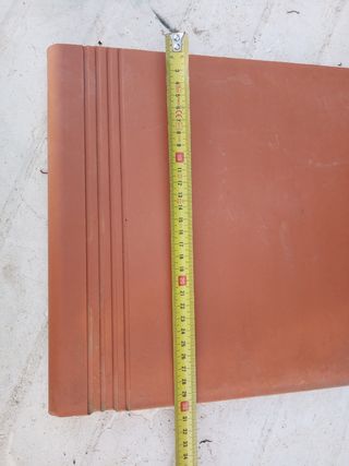 Baldosa de terracota con un diseño de líneas verticales en un lateral las medidas en las fotos hay 13 piezas son para escalones no se hacen envíos 3 € la pieza - Material: Terracota. - Color: Rojo/Naranja. - Diseño: Líneas verticales en un borde.