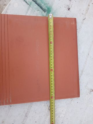 Baldosas de terracota con un diseño de líneas en relieve en uno de sus extremos hay 37 piezas medidas en fotos no se hacen envíos 3 € por pieza - Material: Terracota. - Diseño: Líneas horizontales en relieve.