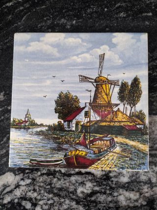 Conjunto de seis azulejos decorativos vintage de Holanda, con escenas de molinos de viento. El precio es por unidad y se venden juntos o por separado. Medidas 15x15 cm - Pintados a mano con detalles. - Diseño tradicional de Delft. - Motivos de paisajes y molinos. Recogida en San Pedro de Alcántara o en Málaga capital.