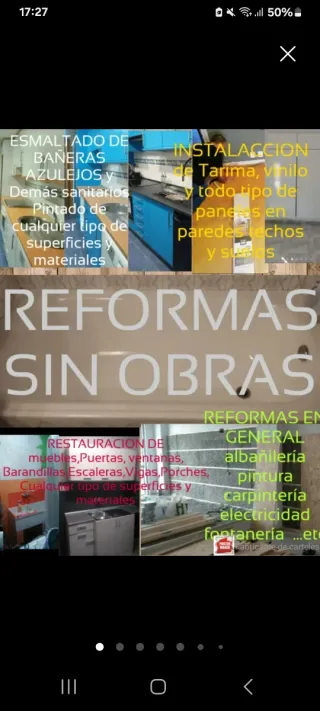 Servicios de reformas integrales y parciales, con o sin obra. - Esmaltado de bañeras, azulejos y sanitarios. - Pintura de todo tipo de superficies y materiales. - Instalación de tarima y vinilo OSB pladur etc - Restauración de muebles, puertas y ventanas. - Albañilería, pintura, carpintería, electricidad y fontanería RAPIDO LIMPIO Y ECONÓMICO Más de 25 años de experiencia 613 29 09 05