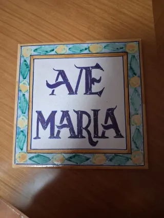 Precioso azulejo decorativo con la inscripción Ave María. - Diseño artesanal. - Marco con motivos geométricos. - Ideal para colgar o como pieza decorativa.