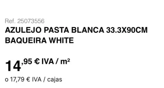 Baldosa de cerámica con acabado brillante. En total 5 paquetes. A 20€ el paquete de 50 piezas (1m2). Marca Cerámica Antiga - Color: Blanco - Medidas: 10 x 20 cm - Acabado: Brillante