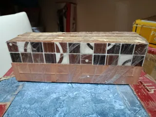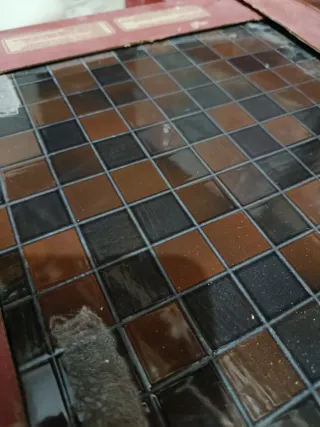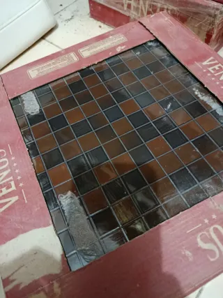 Cajas de azulejos con un diseño de tablero de ajedrez en tonos marrones y negros. Ideales para proyectos de decoración. 1,58m2 cada caja. Total 3,16m2