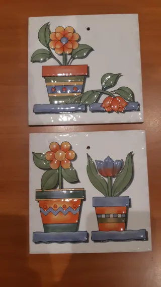 Conjunto de dos azulejos decorativos con motivos florales. - Diseño de flores en macetas. - Colores vivos y alegres. - Ideal para decorar cualquier espacio. - Llevan agujero para colgar. - Miden 15x15 cm. - Alcora, España.
