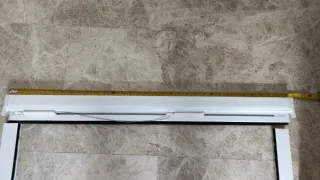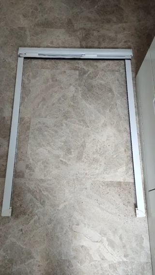Mosquitera enrollable de color blanco, ideal para ventanas o puertas. - Marco de aluminio. - Sistema de enrollado. - Malla de fibra de vidrio.