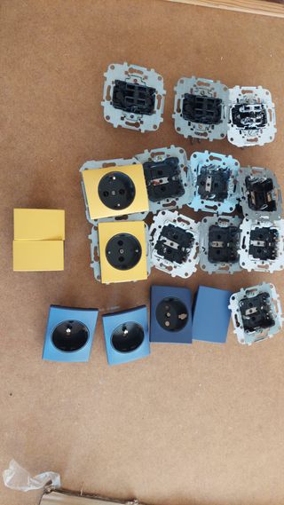 Lote de material niessen olas, lote compuesto de los mecanismos de 3 interruptores dobles y 9 enchufes; mas las teclas dobles de un interruptor doble y dos tapas de enchufe en amarillo y, en azul, una tecla de interruptor normal y 3 tapas de enchufes. - Diseño moderno y elegante. - Material de alta calidad.