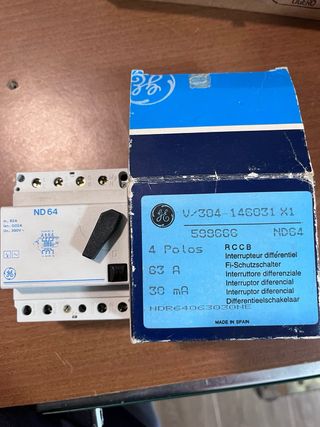 Interruptor diferencial marca GE, modelo ND64. - Corriente nominal (In): 63A. - Corriente de defecto (IΔn): 0.03A. - Tensión nominal (Un): 380V~.