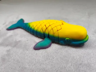 Figura articulada de ballena beluga fabricada en impresión 3D, con un diseño flexi. El diseño es flexible y permite el movimiento completo del cuerpo desde la cabeza hasta la cola. Modelo: Ballena Beluga "Flexi". Longitud: 17 cm aproximadamente Material: PLA (plástico biodegradable). Color: Degradado tricolor (amarillo, verde, azul). Tipo: Juguete sensorial / Fidget / Decoración / Antiestrés Estado nuevo. Movimiento fluido sin piezas sueltas.