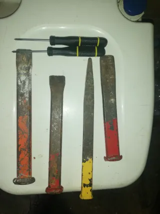 Lote de herramientas que incluye cuatro cinceles y dos destornilladores. - Cinceles de diferentes tamaños y puntas. - Destornilladores con mango ergonómico.
