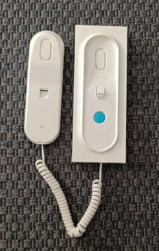 Interfono de la marca Fermax en color blanco. Un dispositivo de comunicación para el hogar. - Diseño moderno y elegante. - Cable en espiral.