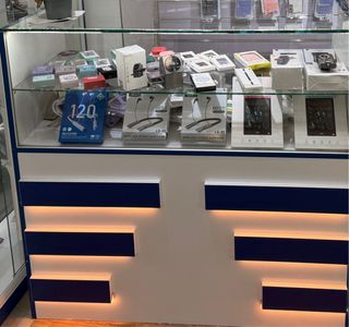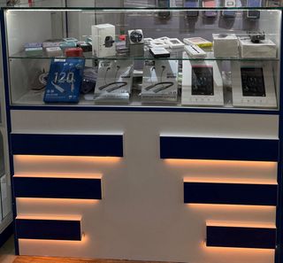 Mostrador de tienda con un diseño moderno y elegante, ideal para exhibir productos. - Diseño de tres niveles. - Iluminación LED integrada en cada nivel. - Acabado en color azul y blanco. wide 1,21m hight 1,1m
