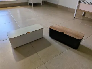 Organizador de cables para mantener tus enchufes y conexiones ordenadas. Ideal para ocultar regletas y cables. - Set de 2 cajas. - Diseño moderno con tapa de madera. - Color blanco y negro.