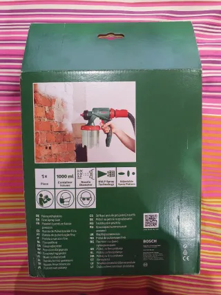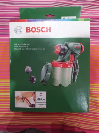 Pistola de pintura Bosch para aplicaciones de baja presión. Incluye varios accesorios para diferentes usos. - Modelo: Feinsprühpistole / Fine Spray Gun - Capacidad del depósito: 1000 ml - Diámetros de boquilla incluidos: 2.0/2.5/3.0 mm